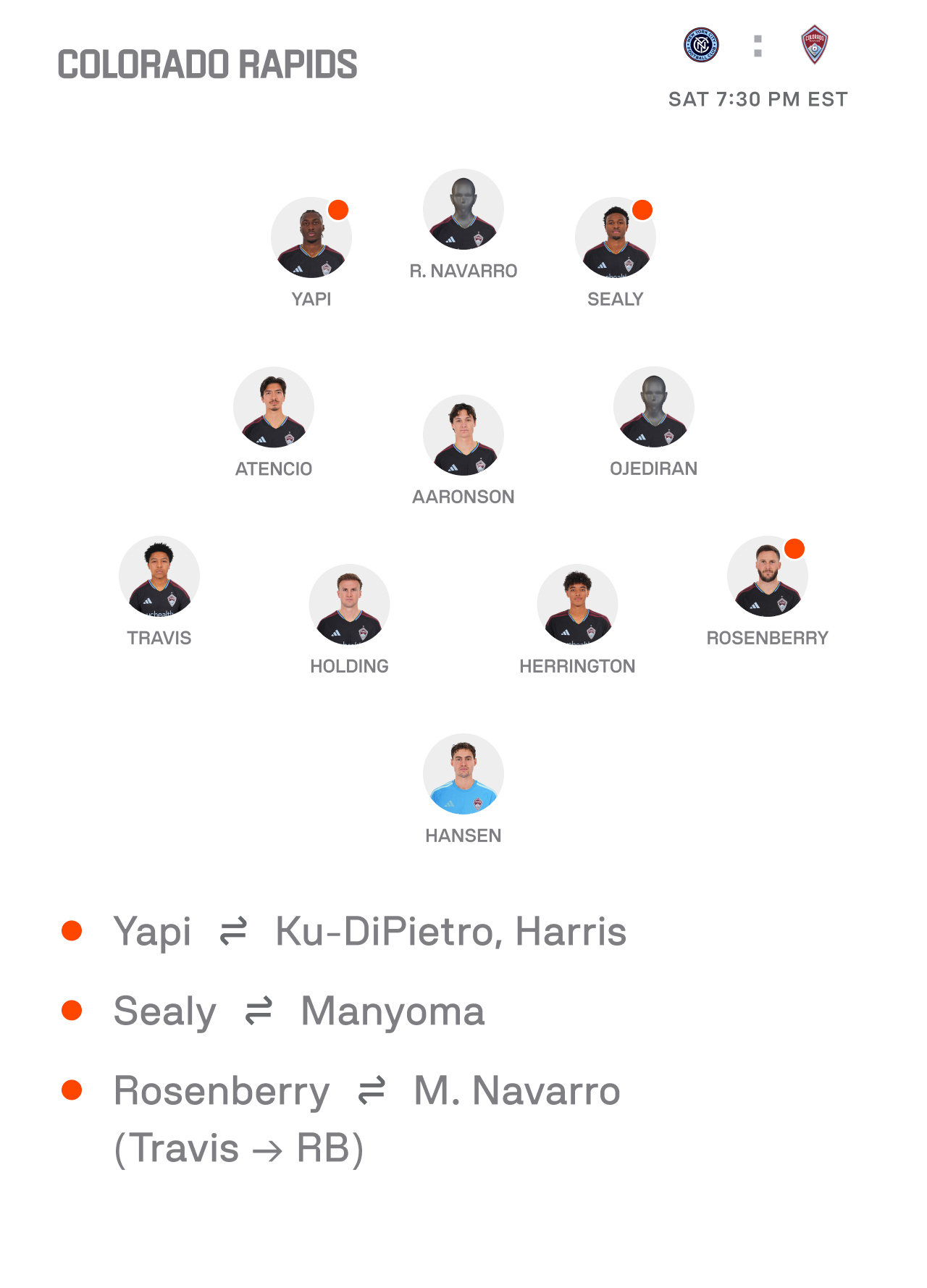 In midfield, Keaton Parks made his return to the Starting XI following a 2025 season in which he missed from June onwards due to a leg injury. He had an impactful game against Orlando scoring two goals in their 5-0 rout of the 10-man Lions. Aiden O'Neill was signed last summer and has been a plug-and-play starter ever since. Both offer balance in midfield. How they match up and organize against the Rapids midfield will ultimately decide the game and with how small the field at Yankee Stadium is, we're sure to see plenty of midfield battles from both teams in an effort to carve out some space in the middle to work with and out of.