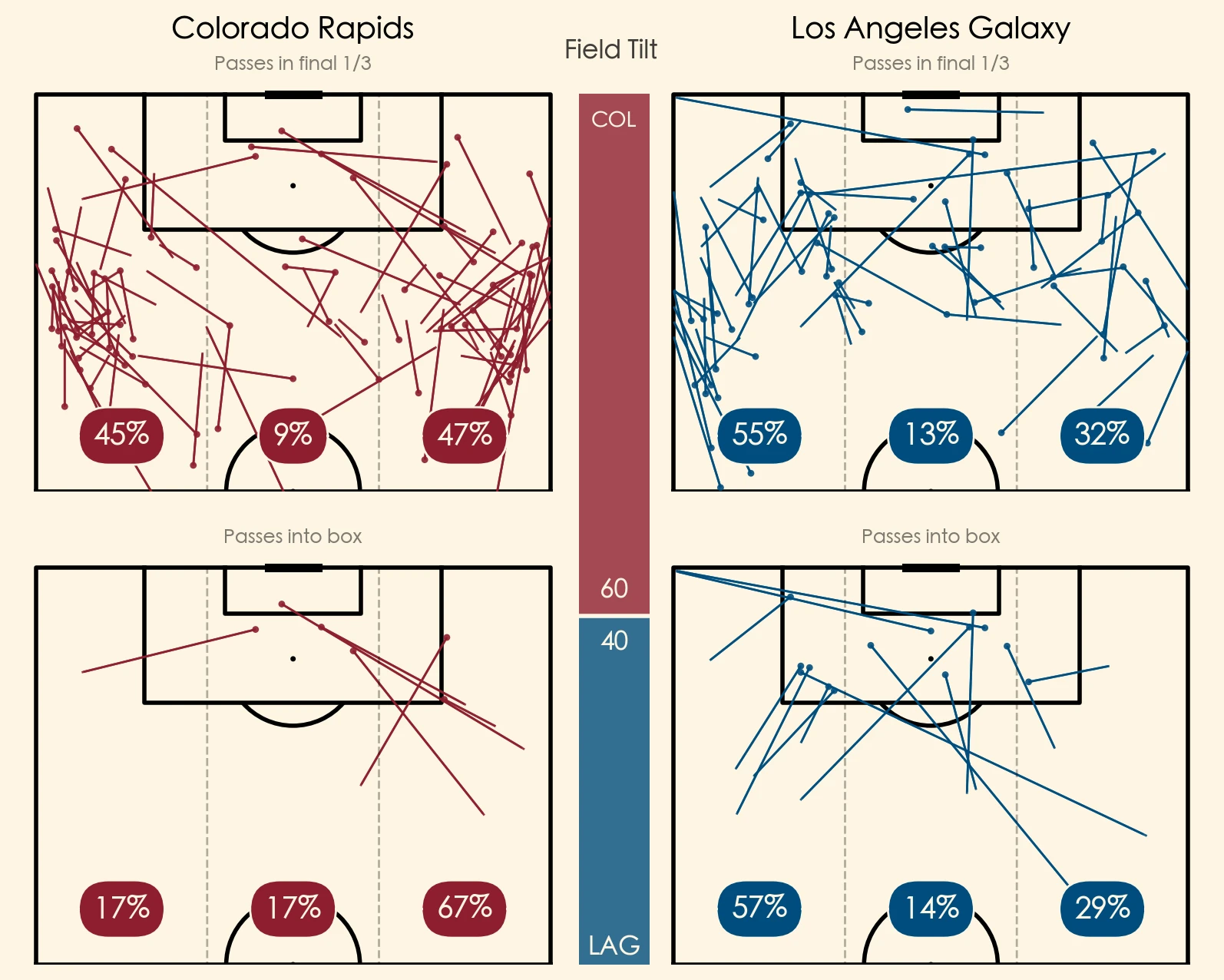 Colorado invited a lot of the Galaxy's long diagonal switches. LA were allowed time on the ball to find the switch, but the Rapids 4-2-4 pressing shape still posed plenty of questions and never let them settle in to find the inside pass.