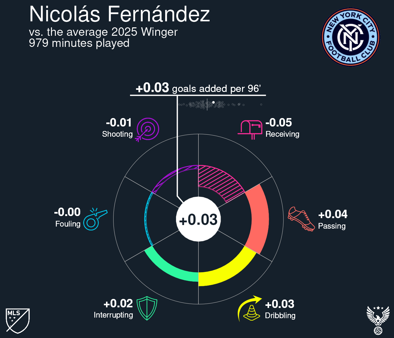 Spearheading New York's attack is Nicolas Fernandez Mercau who has been an absolute treat to watch for this City team. Before Alonso Martinez' season ending injury last season, the two made for a dynamic attacking duo and as a winger, Mercau was incisive, combined well with Martinez, and produced almost immediately.