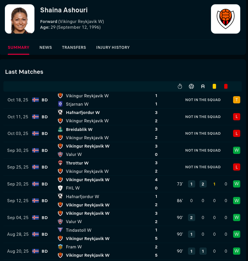 Staying in the obscure leagues of the world, we got to Reykjavik to find Shaina Ashouri. The Parker, CO born midfielder has played most of her career abroad. Ashouri, 29, had a respectable season at Vikingur in the Icelandic First Division. She played a total of 7 games this year, down from last season's 23, and scored six goals. Ashorui had initially left Vikingur last season in October of 2024 but re-signed a deal with the Icelandic side back on July 7th of this year.